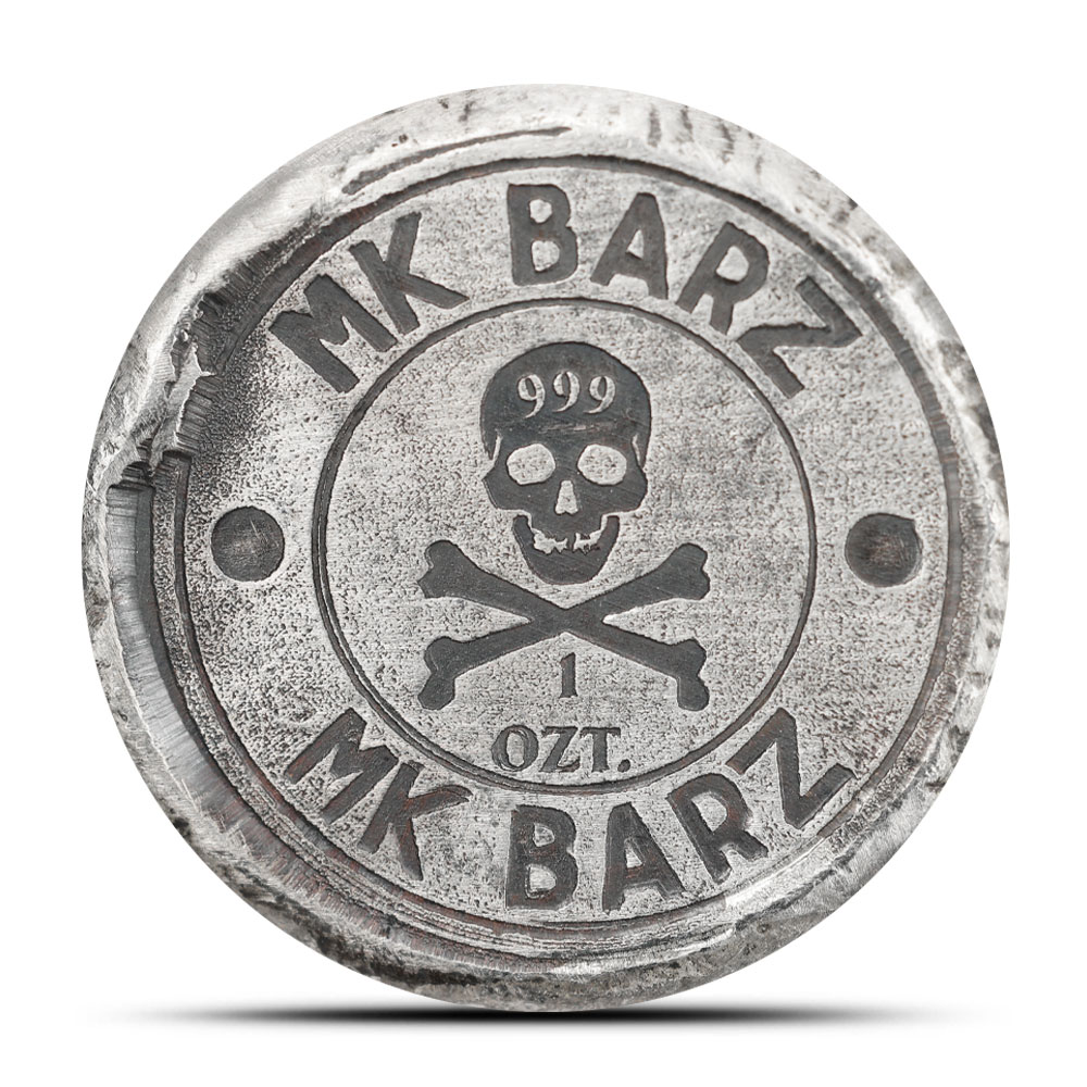 For the reverse of 1 oz Double-Headed Eagle Silver Rounds, the MK Barz logo is at the center. The skull-and-crossbones logo is accompanied by the brand name, weight, and purity of the silver round.