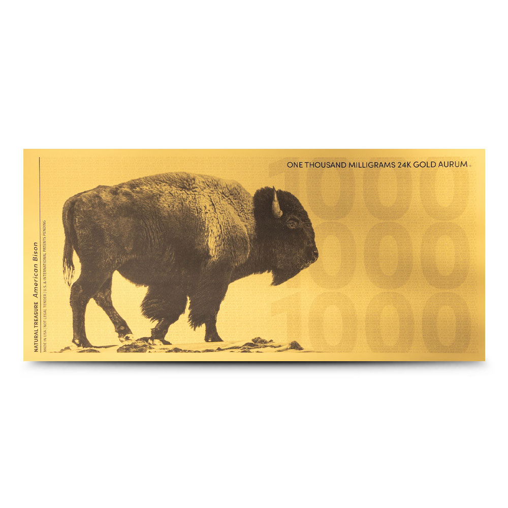These 1000 Milligram Aurum Natural Treasures American Bison Gold Notes are available here with plastic sleeves. Each note is part of the Natural Treasures Series.