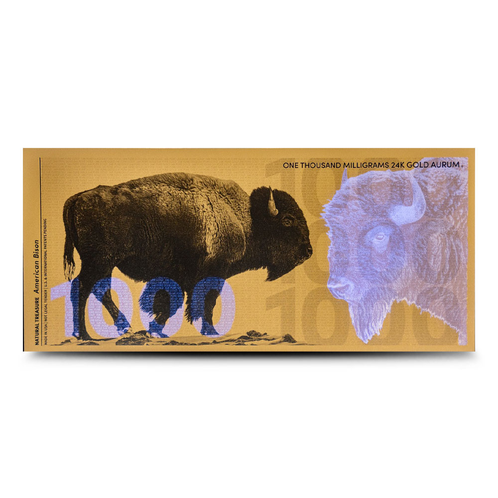 On the obverse of 1000 Milligram Aurum Natural Treasures American Bison Gold Notes, you’ll find a large bison in the foreground with a smaller one depicted in the background. The background field includes a forested mountain setting. Plains bison are ecosystem engineers whose grazing patterns, wallowing behavior, and movement across the landscape helped shape and maintain the prairie grasslands, supporting countless other species in the process. The reverse of Aurum Natural Treasures American Bison Gold Note comes with a depiction of an American bison. The security element appears on this side when the note is under a UV light.