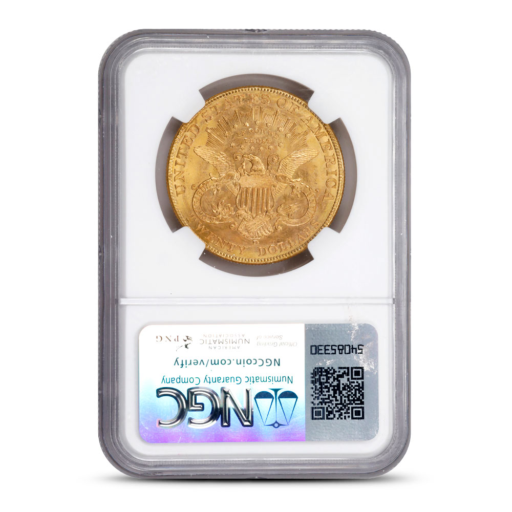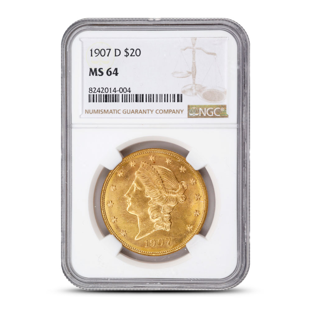 This 1907-D Pre-33 $20 Liberty Gold Double Eagle Coin is in Mint State 64 condition. This classic Liberty Double Eagle has strong strike details on both sides, with a rich yellow-gold toning throughout and slight hues of orange around protected areas of the surface. While more than 842,000 coins were struck by the Denver Mint, the NGC notes only 381 coins at this grade from that original mintage.