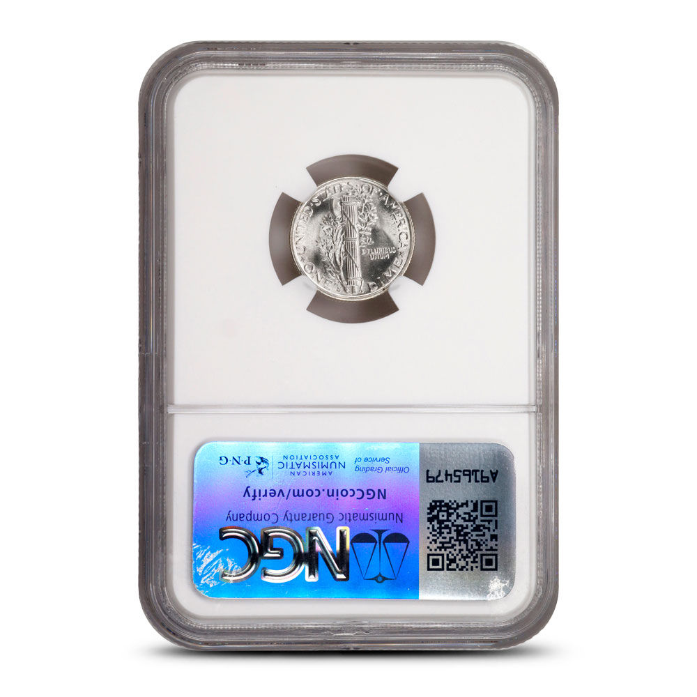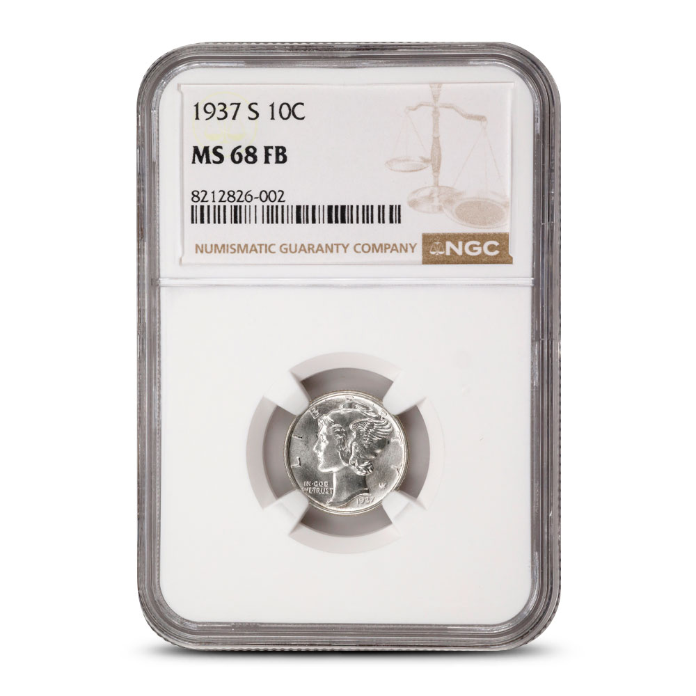 This 1937-S Mercury Dime Coin is in Mint State 68 condition with full, original mint luster and no more than four minor contact marks. This particular coin has frosted, unblemished fields with brilliant, silver-white luster and no trace of toning. The FB designation indicates the coins have a fully struck band.