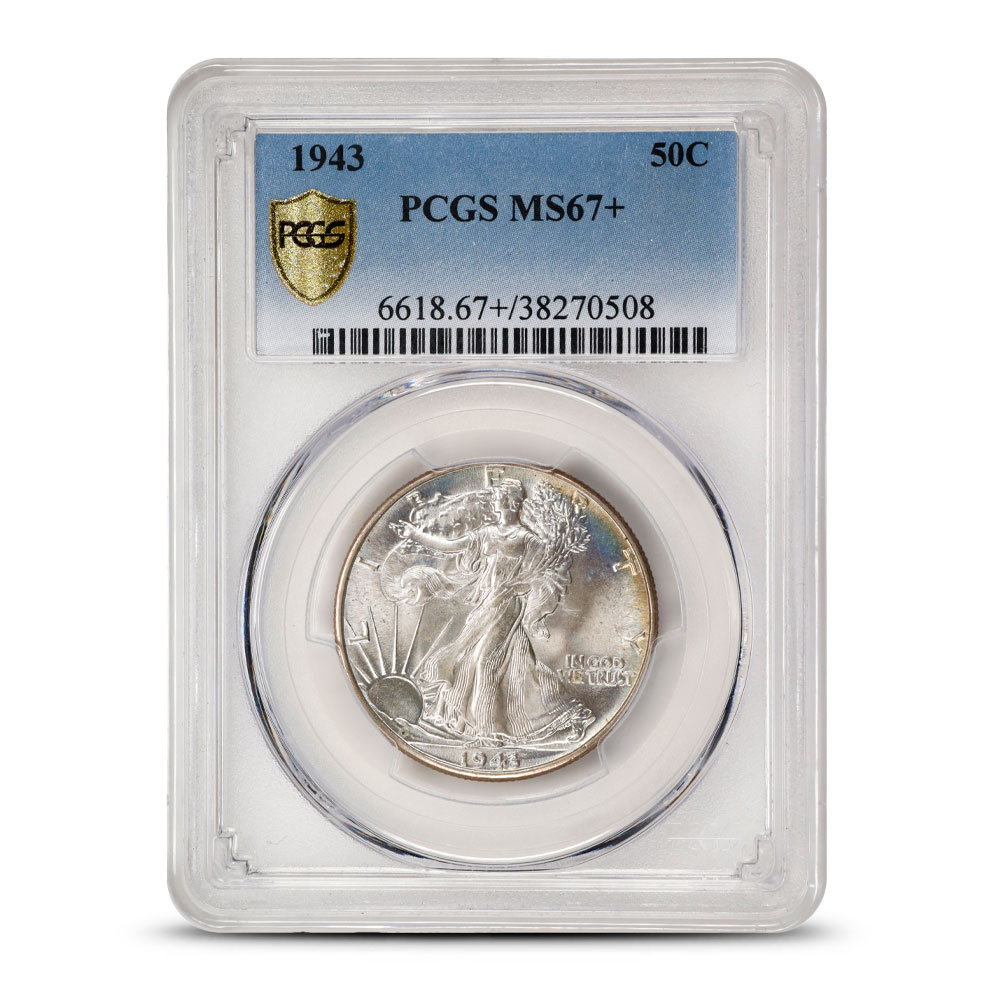 This 1943 Walking Liberty Half Dollar earned an MS67+ grade, indicating it is among the top MS67 specimens. The typical MS67 coin exhibits original mint luster with three or four small contact marks, one or two of which may be in the primary focal areas. This coin has very few distractions and razor-sharp detail on the highest relief points of the designs. There is a subtle halo of golden amber and rose toning around the edges of both sides.