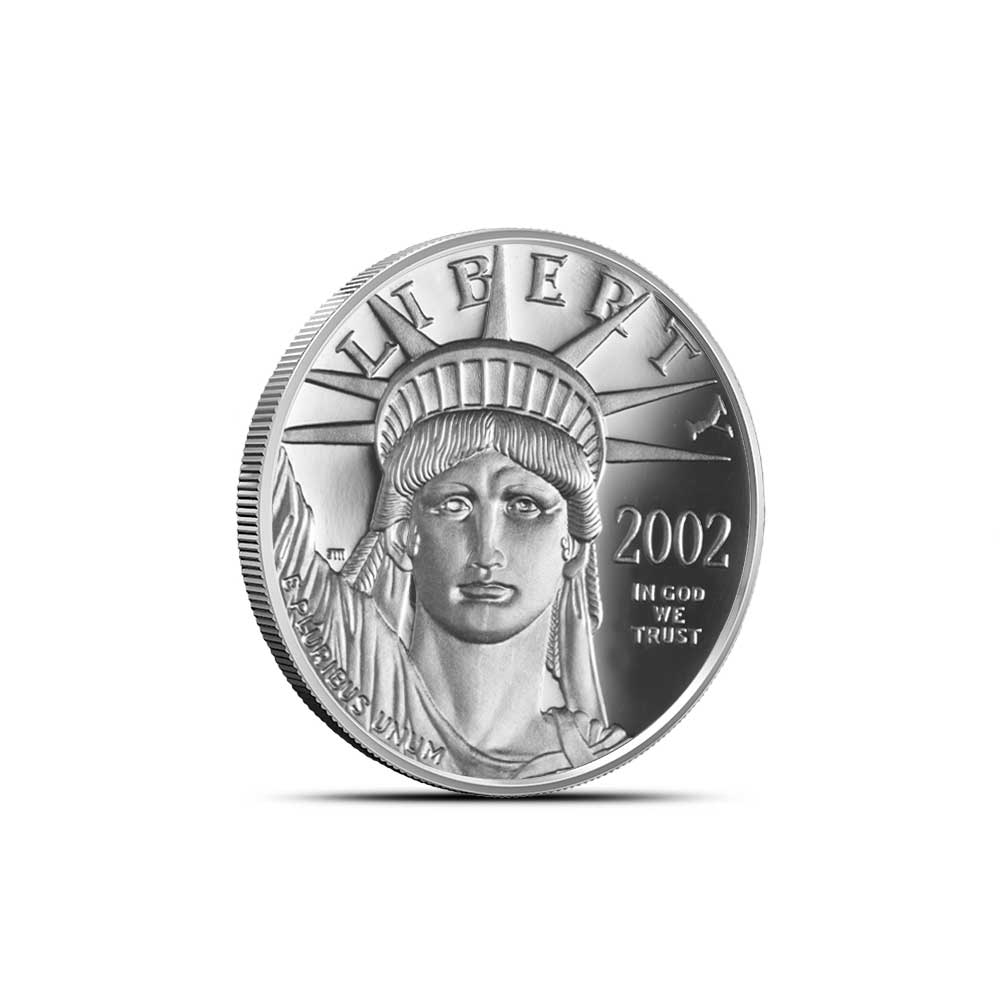 The obverse of the 2002 Proof American Platinum Eagles comes with a depiction of the face of the Statue of Liberty. This design was created in 1997 for the program’s debut by John Mercanti. This image still graces the obverse of all BU Platinum Eagles and was on the obverse of Proof Platinum Eagles from 1997 to 2017.