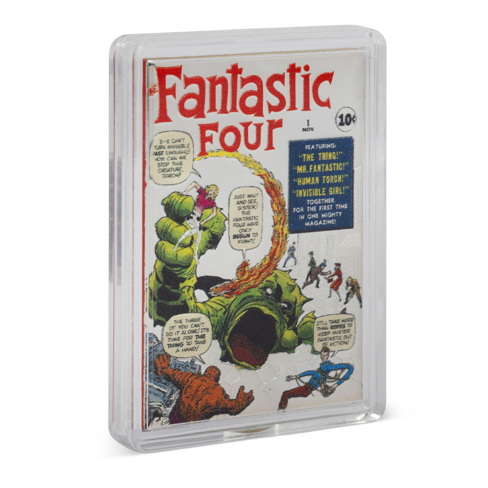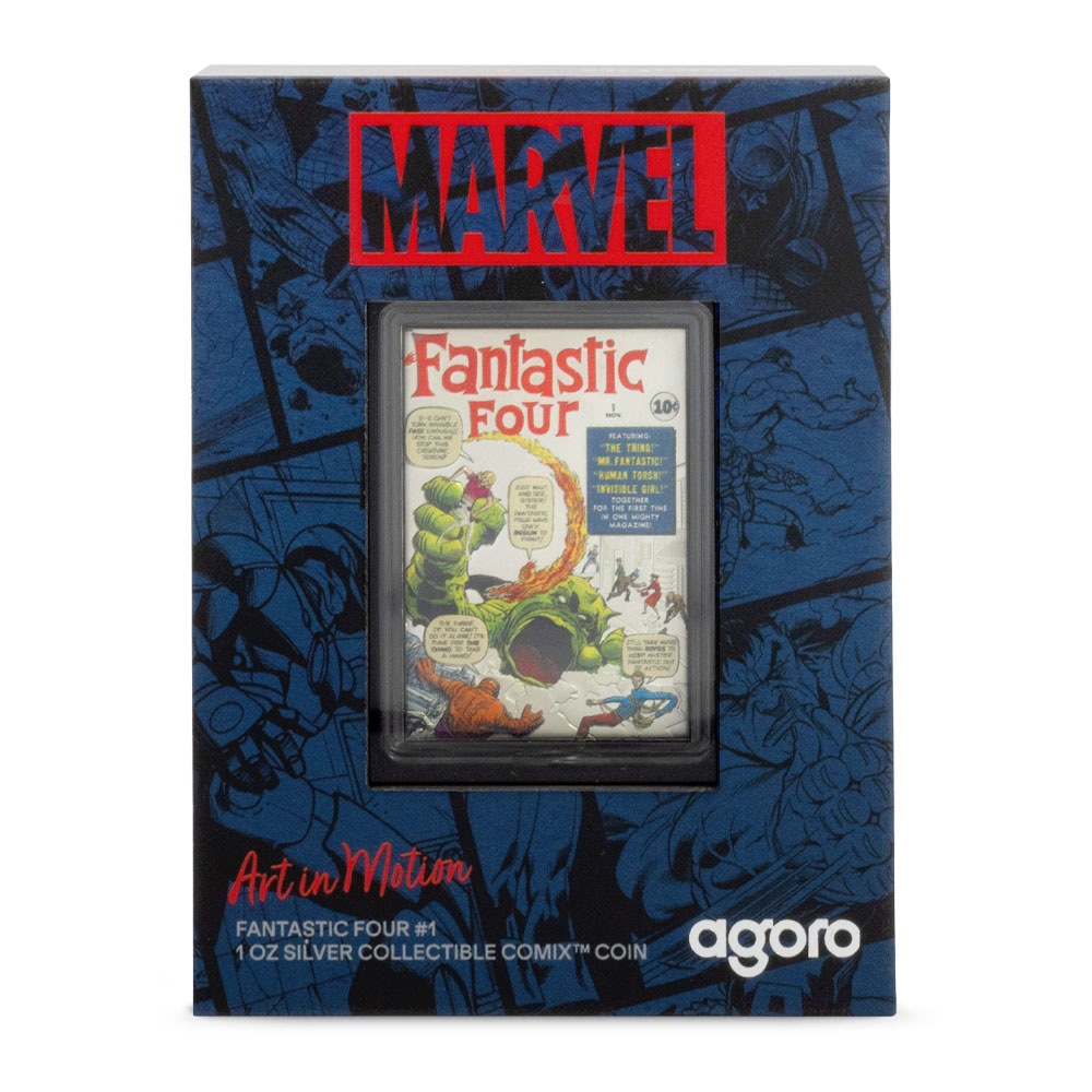 All 2025 1 oz Proof Colorized Niue Silver COMIX Fantastic Four #1 Cover Coins are available with a Marvel-themed presentation window box. The coins come with a Certificate of Authenticity and boast beautiful colorization. The reverse cover art on the coin is completed with a brilliant colorization and is set against a frosted background. The four outer sides of the coin are also colorized to reflect the appearance of the spine and pages of a comic.