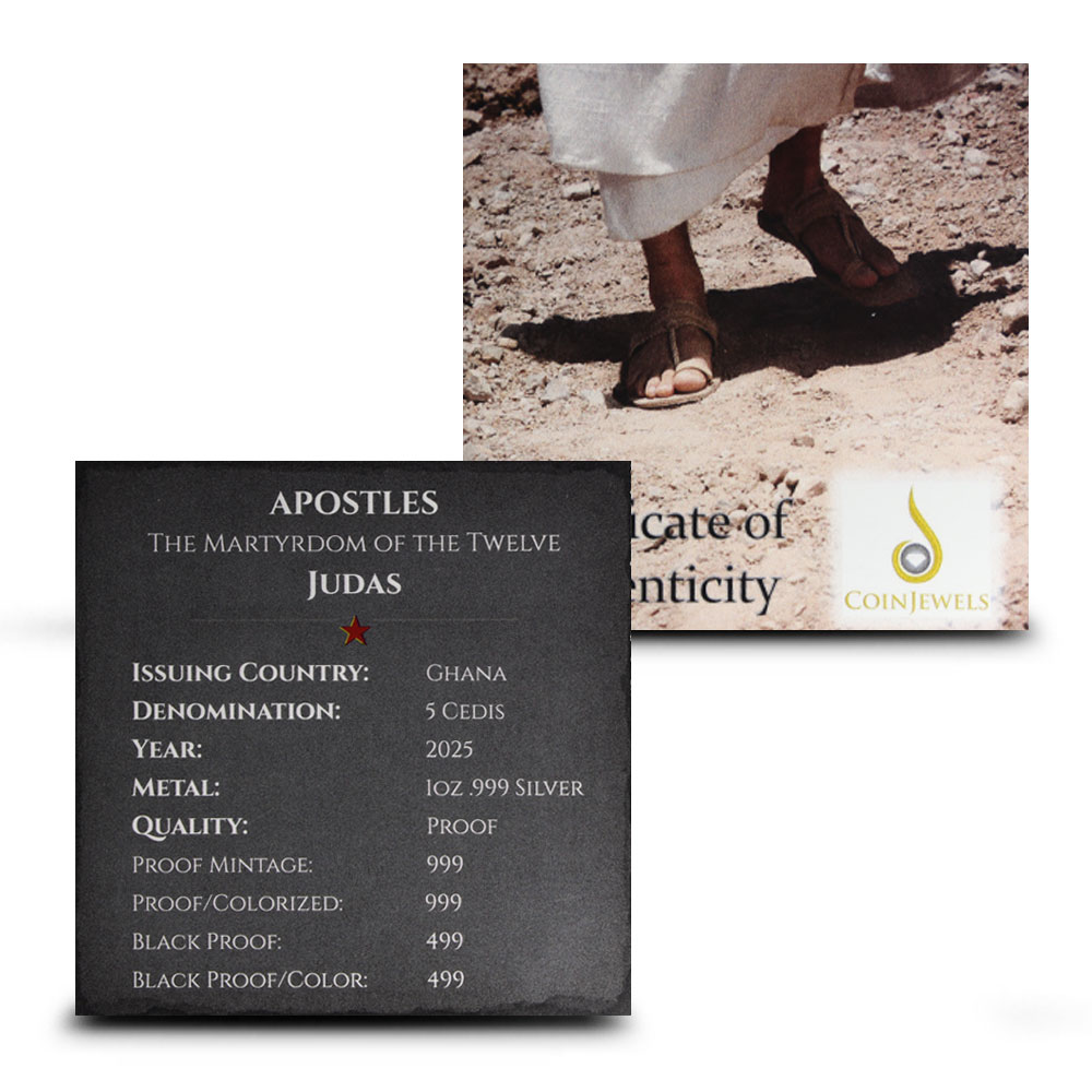 The new Martyrdom of the Twelve Series is a collection of spiritual-themed silver coins with designs commemorating the twelve apostles of Jesus Christ. Each individual is represented in proof silver, colorized silver, black proof, and colorized black proof releases that showcase the moment of their death. Right now, 2025 1 oz Proof Republic of Ghana Silver Judas Iscariot Coins are available from JM Bullion.