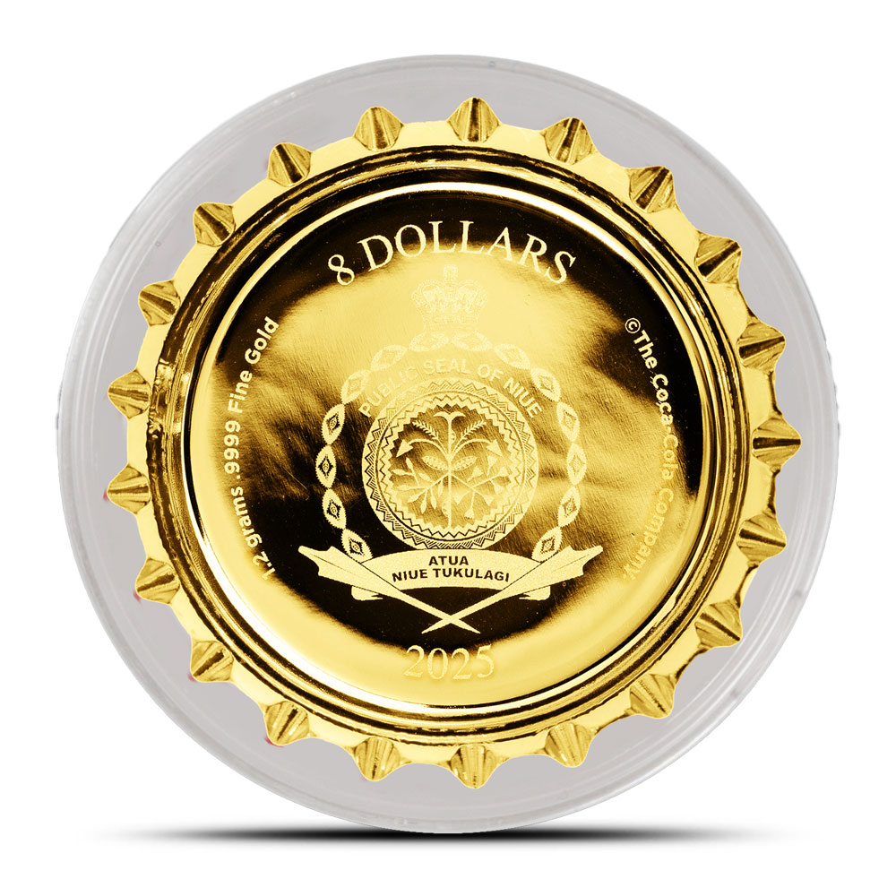 All 2025 1.2 Gram Niue Gold Coca-Cola Bottle Cap Coins available here are the exact size of a real Coca-Cola bottle cap. The coin is housed in a custom capsule and comes with both a Coca-Cola-branded tin and a shipping box. Each coin comes with a Certificate of Authenticity.