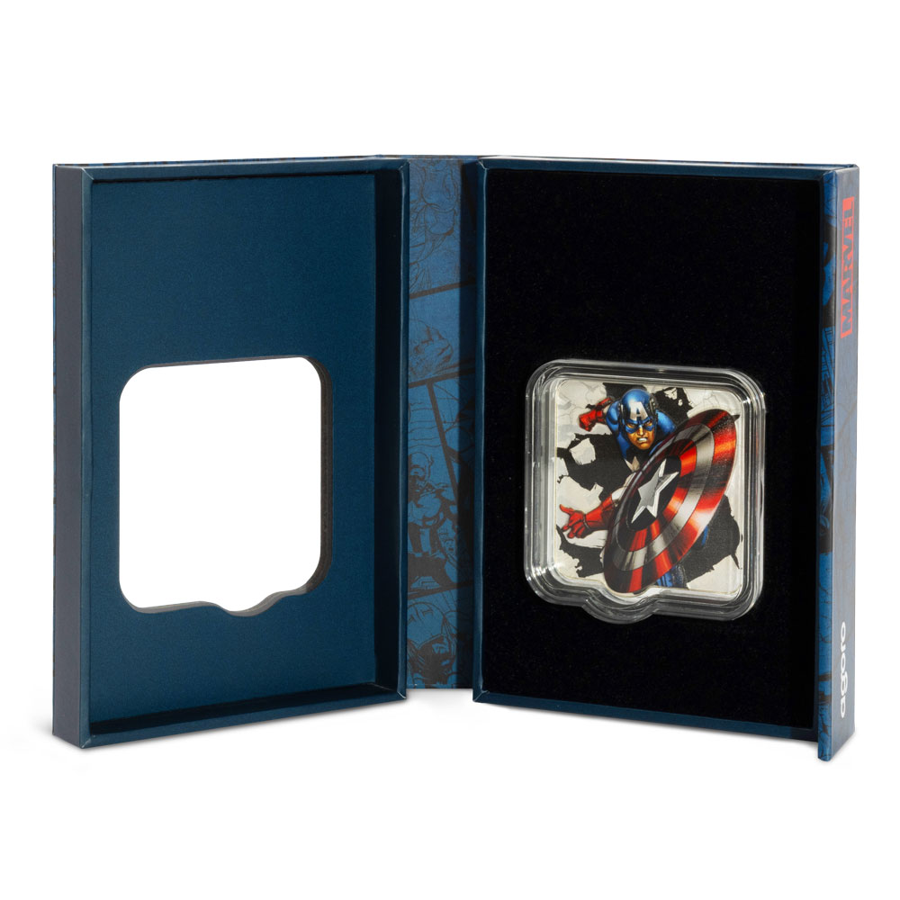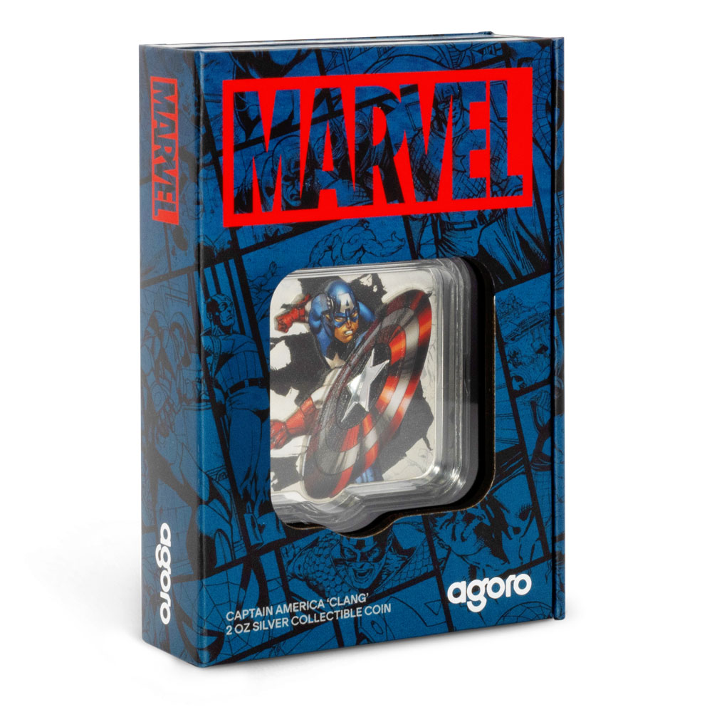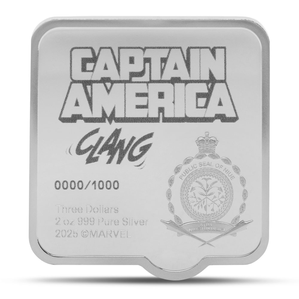 These 2025 2 oz Proof Colorized Niue Silver Captain America Clang Coins are available in presentation boxes and come with a Certificate of Authenticity. The coins are square specimens with 3D relief on the reverse design element, as well as colorization on Captain America and his shield.