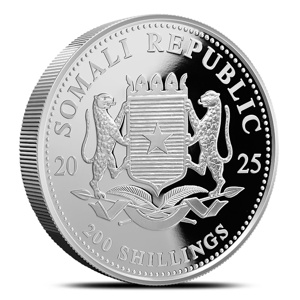 The obverse side of the 2025 Somalia Silver Elephant features the national coat of arms. The seal for Somalia includes a crowned shield with a single star set at the center in front of a background of horizontal lines. The shield is supported on each side by a leopard, with crossed spears and palm fronds beneath.