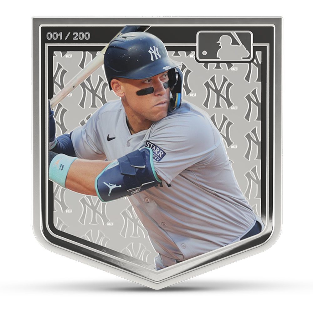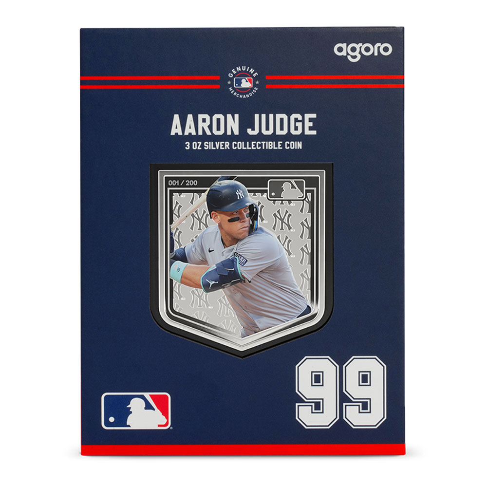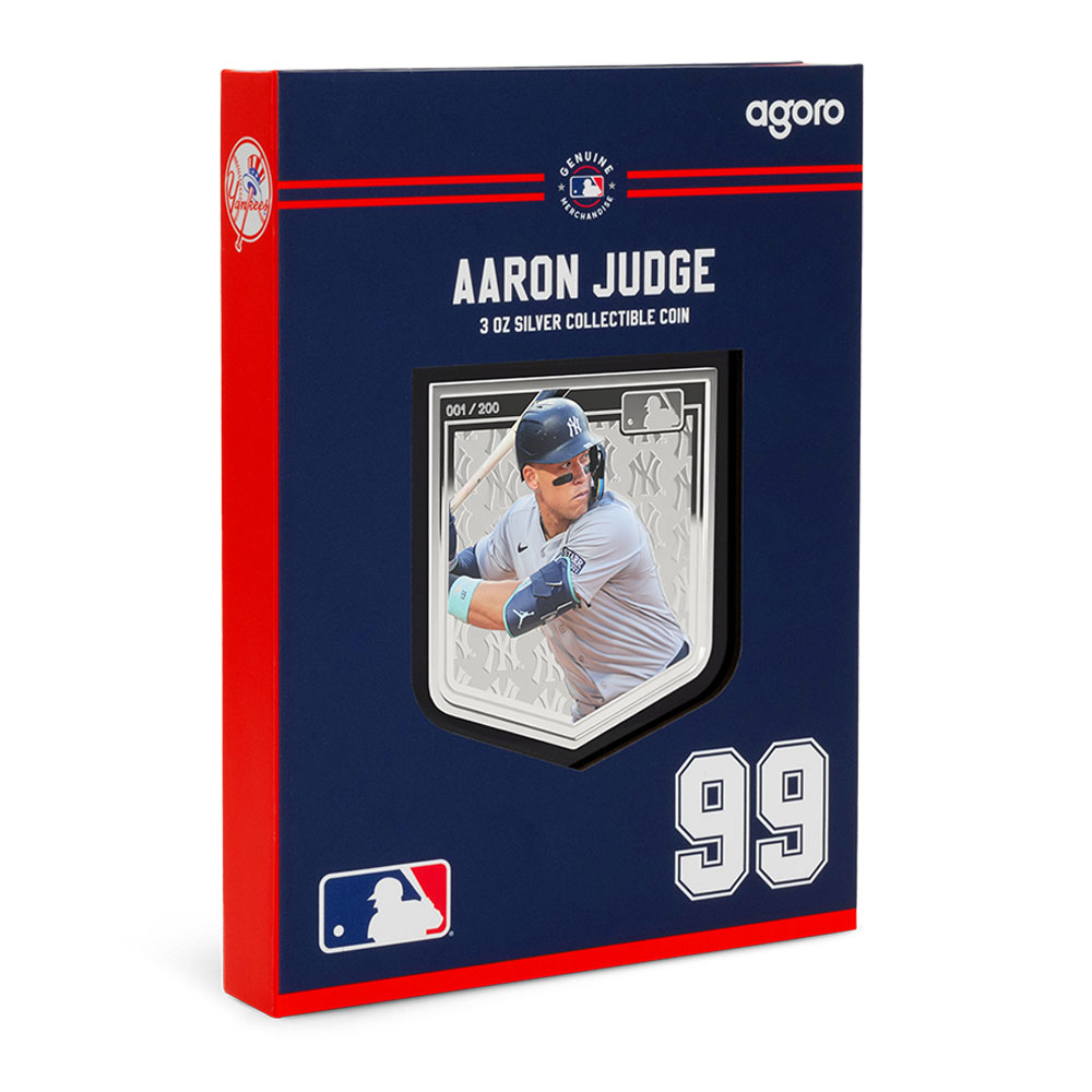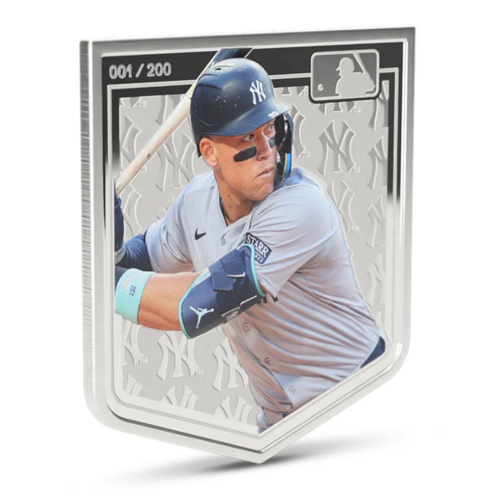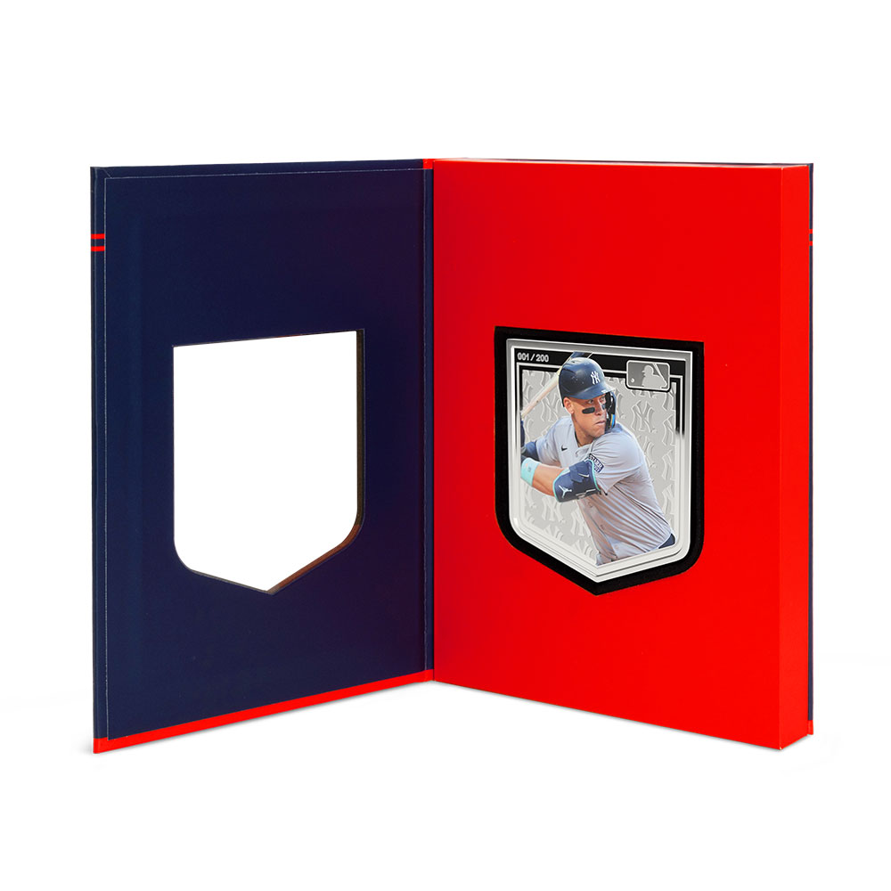 All 2025 3 oz Proof Colorized Niue Silver Major League Baseball Aaron Judge Coins are available with a presentation box and a Certificate of Authenticity. Each coin features a unique serial number on the reverse, with selective colorization also incorporated into the reverse design field. Overall, the coins have proof visuals throughout that include frosted designs and mirrored fields.
