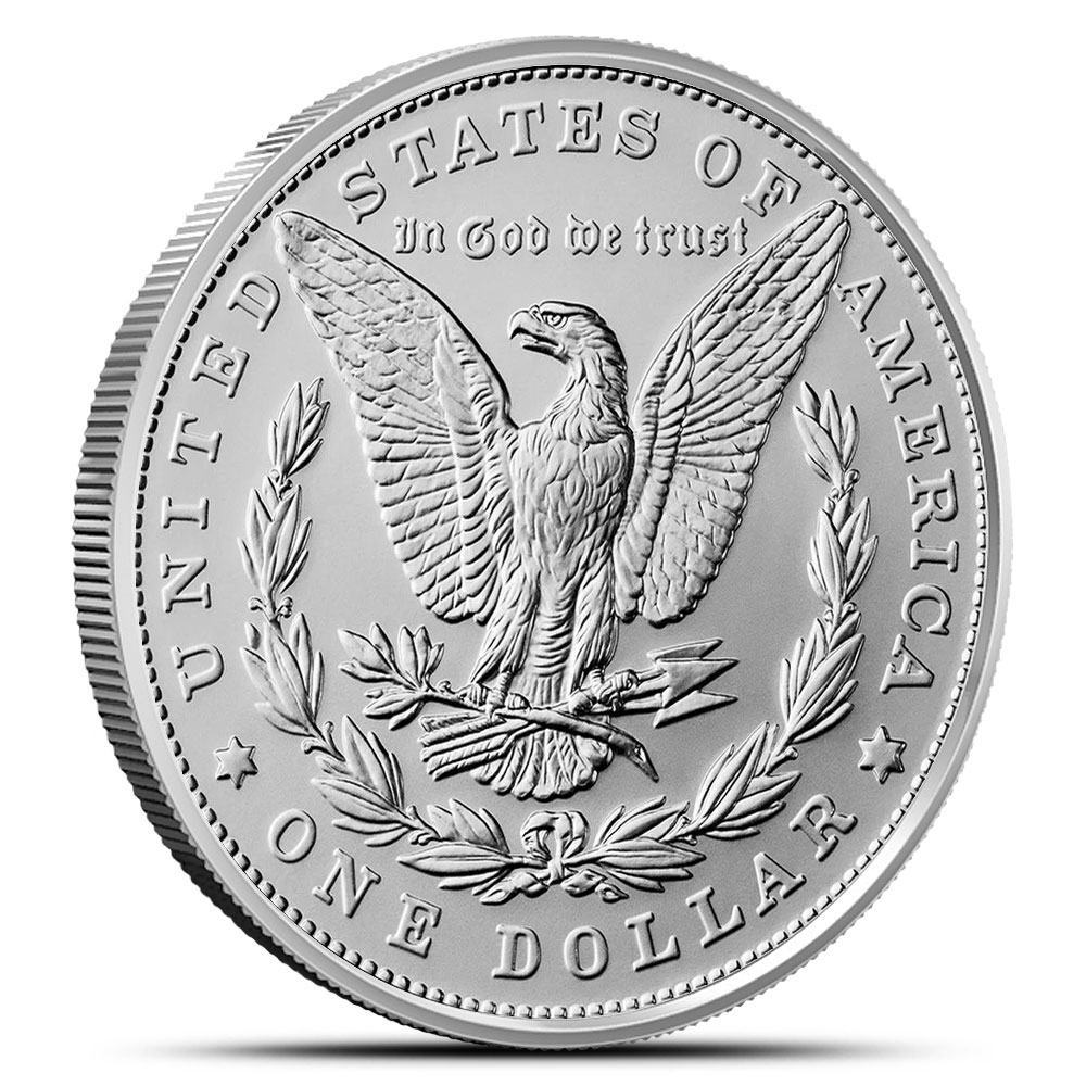 On the reverse of 2025 Morgan Silver Dollars, you will find Morgan’s depiction of the heraldic eagle. This design shows a front-facing bald eagle with spread wings. The talons of the eagle clutch the arrows of war and the olive branch of peace.