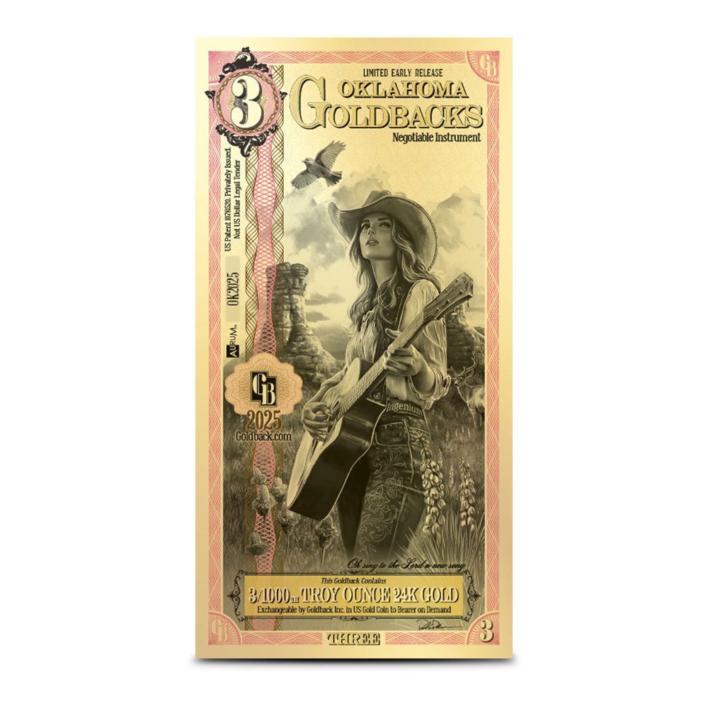 The Oklahoma Goldback Series is the latest in the growing collection of Goldback notes. These notes are unique not only for their distinct designs representing each state featured in the series, but also for their status as a form of voluntary currency. The Oklahoma Goldback is the first series to feature a 3 Goldback denomination, but with limited numbers available only in an Early Release. Right now, 3 Oklahoma Limited Early Release Goldback Gold Notes are available in perfect condition from JM Bullion.