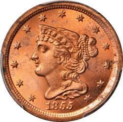 Uncirculated: If an 1855 Braided Hair Half Cent is determined to be of Uncirculated grade, this means that the coin was probably never out on the open market. Having never exchanged hands, these pieces will be in absolutely pristine condition. Unfortunately, there are few of these—if any—remaining.