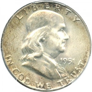 The Franklin Half Dollar is a widely recognized and popular U.S. coin minted from 1948-1963. The 1951 Franklin Half Dollar has been circulated for over half a century now and given the coin’s age, many of those available today are not in perfect condition. These coins remain quite popular, however, among collectors for several reasons. Franklin Half Dollars can, however, still be bought and sold in brilliant, uncirculated condition. Coins in this condition appear to be brand new and may carry significantly higher premiums because of their excellent condition.