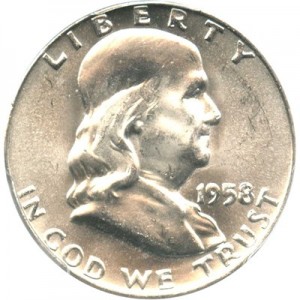 The 1958 edition of the Franklin fifty cent piece carries a reasonable premium. A 1958 mint year fifty cent piece in very fine condition may be bought or sold for about $13, while the same coin in extremely fine condition may be valued about $1 higher. Values can rise based on the coin’s condition or assigned grade.