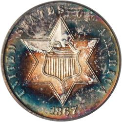 Uncirculated: If an 1867 Silver Three-Cent Piece is graded as being Uncirculated, this means that the coin never made it onto the open market and never had a chance to be damaged. As a result of it being kept in safekeeping since it was minted, an Uncirculated coin will appear to be flawless.