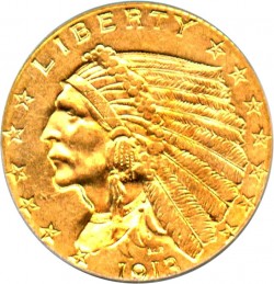 The 1913 Indian Head $2.50 Gold Coins were originally the most common in the series, over 700,000 were minted. Of course, with the mass melting of pre-1934 gold coins later in the 20th century, there’s no telling exactly how many 1913 Indian Head $2.50 Gold Coins are left. The Indian Head $2.50 Gold Coin was not appreciated by numismatists, and the public believed the incuse design would harbor bacteria.