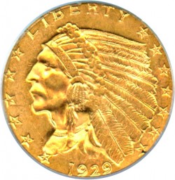1929 marked the last year of Indian Head $2.50 Gold Coin production. Due to the Great Depression, there wasn’t a large need for higher denomination coins. In fact, most U.S. denominations were furloughed during the early 1930s. A little over 500,000 Indian Head $2.50 Gold Coins were minted in 1929 and are considered rare.