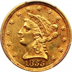 The 1855 Liberty Head $2.50 Gold Coins were designed by Christian Gobrecht and were struck at 3 minting facilities; Philadelphia, Charlotte (C), and Dahlonega (D), with by far most coming from the Philadelphia mint. Considering all 1855 gold coins are scarce, those struck at the Charlotte and Dahlonega mints are the rarest in terms of overall current population numbers; these coins were not saved in vast quantities to begin with, most having later been lost or melted.