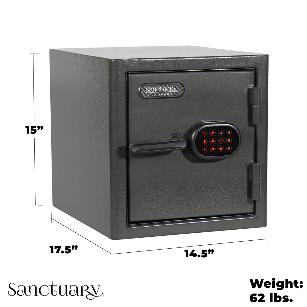The Sanctuary Medium Diamond Safe is built to withstand fires for up to 90 minutes at temperatures reaching 1,800 degrees Fahrenheit. It also remains waterproof for seven days in standing water up to the level of the handle and includes an illuminated locking keypad for added convenience. Each safe is equipped with 5mm steel plates in both active and deadbolt positions, along with all-metal construction in both the keypad and the handle. A silent entry option allows you to unlock the safe quietly and privately.